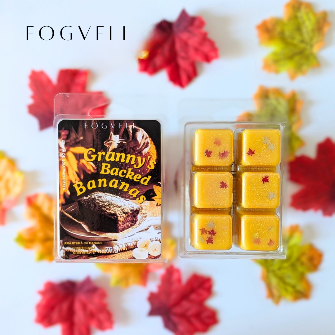 Tableta de ceară parfumată „Granny’s Baked Bananas” 🍌🍞🍁 îți umple casa cu aroma unei prăjituri scoase direct din cuptorul bunicii — banane coapte, scorțișoară și vanilie, perfecte pentru serile tihnite petrecute cu o carte bună sau lângă cineva drag.